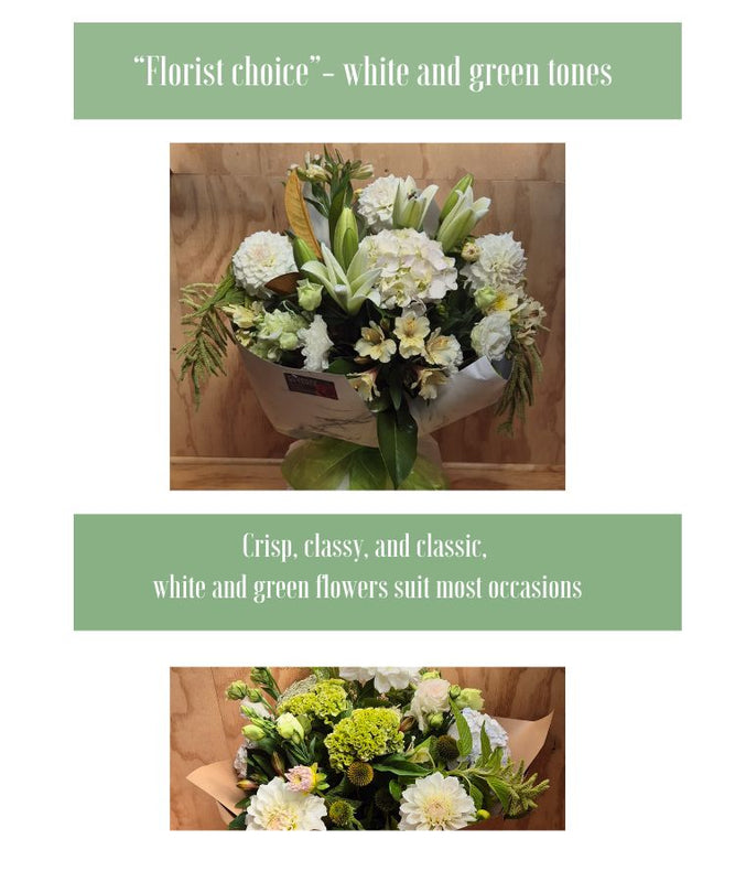 Note: This is florist choice, which means we pick the most beautiful flowers in the colour you have selected and make a bespoke design based on what is available at the time. If you want a particular picture, please phone to discuss if the flowers are available, and how much that bouquet will cost in the current season.