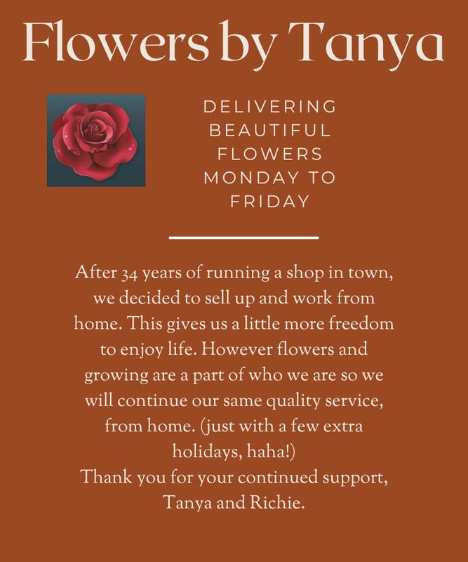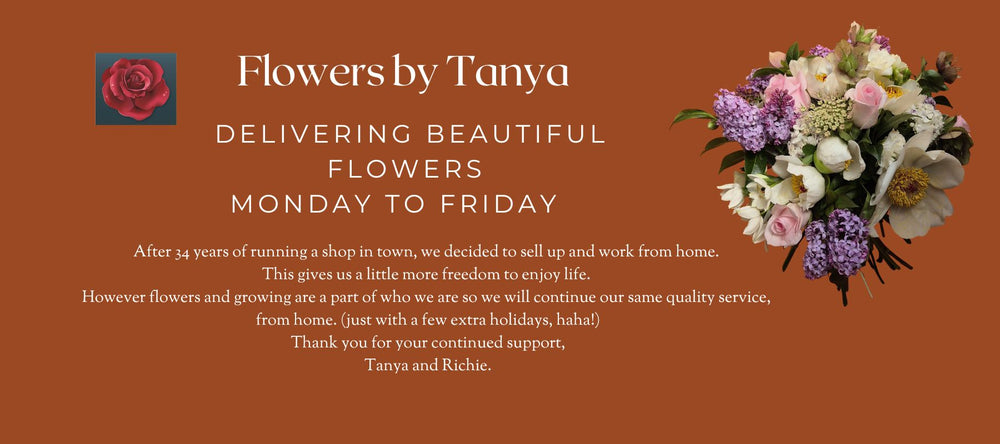 After 34 years running a retail shop in Hastings, Tanya and Richie have chosen to work from home. Here we will continue to grow flowers and create beautiful floral arrangements from our lovely home studio in the country.